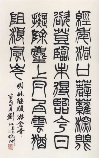 刘江,原名佛奄,号湖岸、知非。1926年7月生,汉族,四川万县人。幼年即喜好书画,承家学,1945年中师毕业后,考入重庆国立艺术专科学校预科习绘画,得校长潘天寿教授书法、篆刻,两年后升入本科油画系学习。
