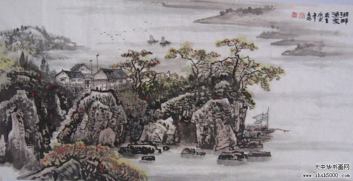 贺文瑞国画 湖畔渔家
