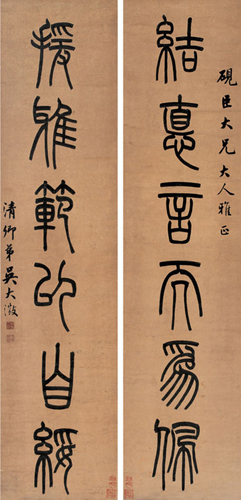 1868进士,累官至广东、湖南巡抚,1894罢归。喜爱金石,并工诗文书画。著有《说文古籀补》、《古玉图考》等。吴大澂书法以篆书最为著名。开始学秦代小篆刻石,书法酷似李阳冰。后受杨沂孙的启示,将小篆与金文相结合。他的篆书大小参差、渊雅朴茂,在当时是一种创造。他对金石文字有精深的研究,开拓了对先秦文字的广阔的视野,使他的篆书从中汲取了不少的营养。吴大澂写篆书,喜用隶书书款。他的隶书横平竖直,亦取法汉碑。行书学曾国藩,又颇有黄庭坚的趣味。