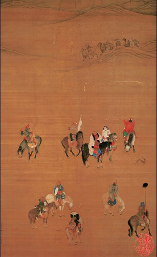 刘贯道,字仲贤,生卒年不详,约为元世祖之人。善画佛道人物,又能做山水、花竹、鸟兽等。他在世的作品极少,在这幅画中是因为下有刻「贯道」二字始知是他的图画。画中人物多接近北宋传统技法,有古典风味,与南宋有明显的分别。或许是因为他出生在北方,较承袭了北宋的画法。