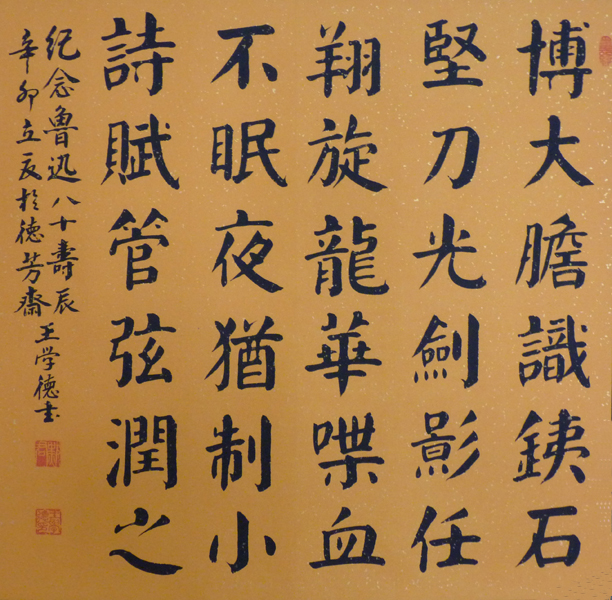 王学德,号子心,怀远,笔名墨君,1942年生,河北廊坊人。现为中国公共关系协会会员,中国文化艺术研究院会员,世界华人美术家协会理事,中华诗词协会创作委员,洛阳市颜真卿研究会名誉会长。自幼酷爱书法诗词,潜心习练书法几十年,书法造诣很深,其书法作品多次参加国内外书画展并获大奖,多幅作品被新加坡,日本,台湾等国家和地区收藏,并被收录于《翰墨丹青颂回归》《国际文化体系》等大型图书。